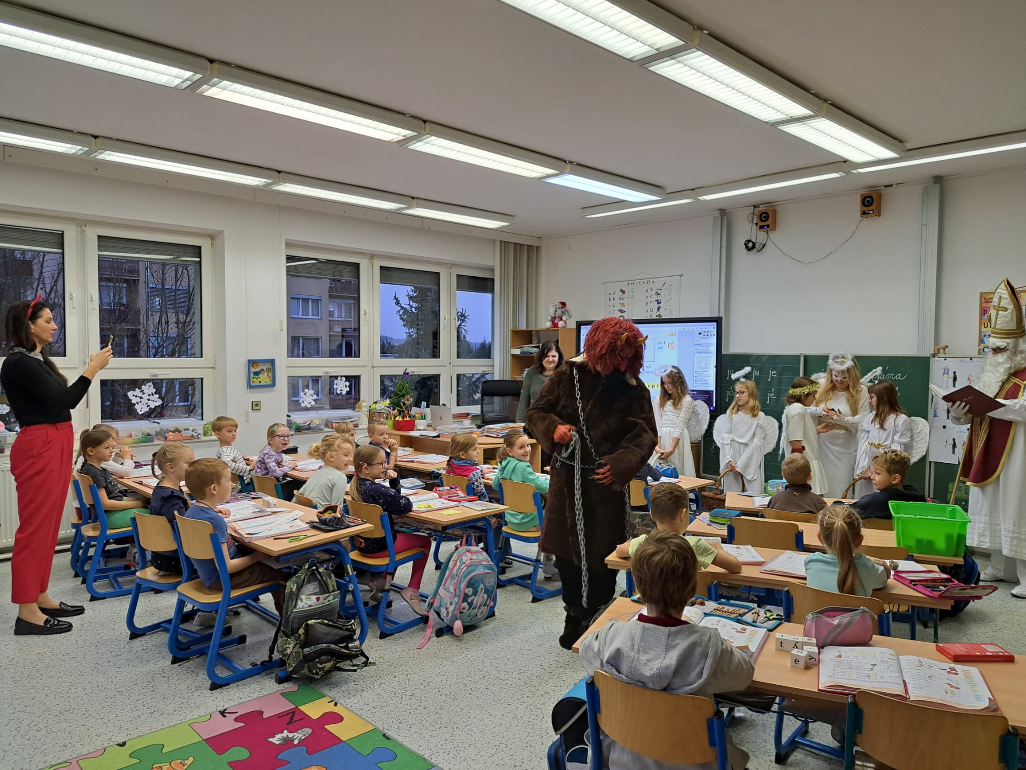 prošel všechny třídy a donesl nadílku. Ovšem nebylo to úplně zadarmo. Nejdříve si vyslechl básničky, písničky, ale zároveň i u některých dětí slib, že již budou hodné.